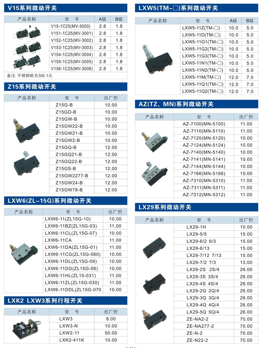 V15、Z15、LXW6(ZL-15G)、LXW5(TM-□)、AZ(TZ、MN)、LX29系列微動開關、LXK2 LXW3系列行程開關
