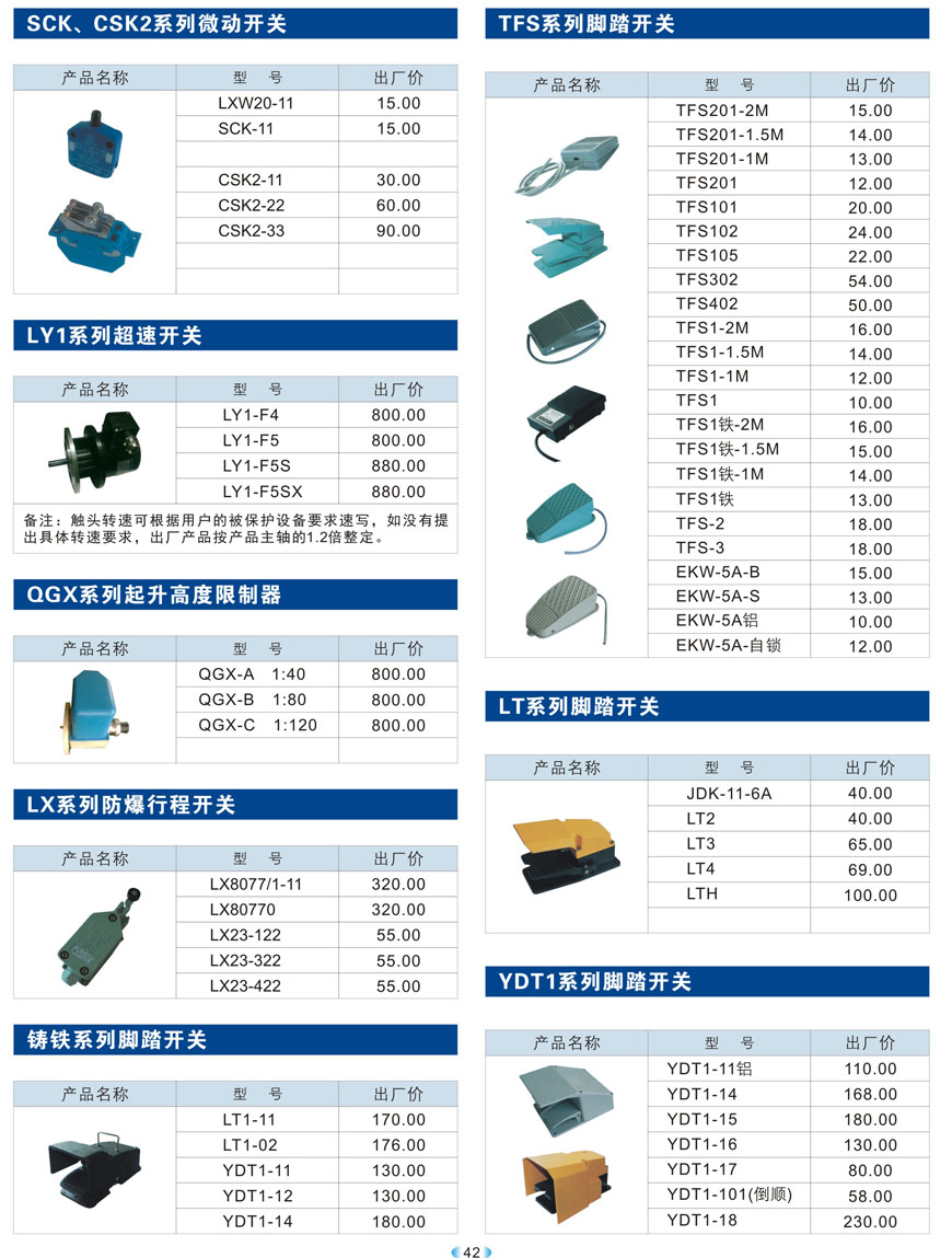 SCK、CSK2系列微動(dòng)開關(guān)、LY1系列超速開關(guān)、QGX系列起升高度限制器、LX系列防爆行程開關(guān)、鑄鐵、TFS、LT、YDT1系列腳踏開關(guān)